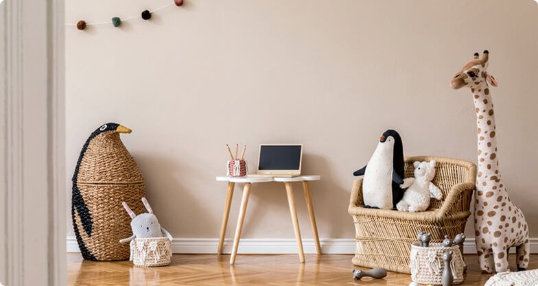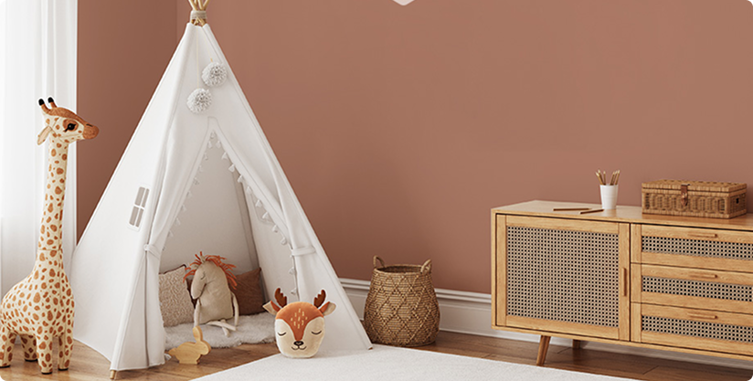 Earthy tones of sage, cream, and light wood bring the calm of the outdoors into the nursery. A mural of a whimsical forest or mountain range adds a touch of adventure, while potted plants and wooden accents foster a natural, grounded feel.